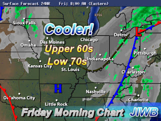 Above is a look at the surface chart for tomorrow morning (Tuesday) around 8:am EDT. Right now it's looking like a day of Mostly sunny skies to Partly cloudy skies across the area. However with that cold front you see off to our west we cannot rule out the slight chance of a few pop up scattered thundershowers within the area. Also we will see a backdoor cold front move through, However it's not gonna cool us any!